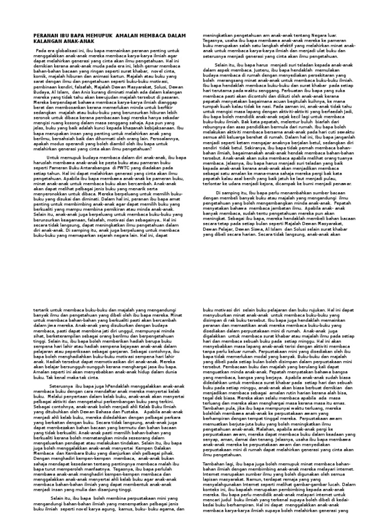 Huraikan Peranan Ibu Bapa Bagi Memupuk Budaya Membaca Dalam Kalangan Anak from imgv2-2-f.scribdassets.com Institusi kekeluargaan adalah antara unit penting dalam kehidupan bermasyarakat. Keberadaan suatu pohon juga bisa dianggap mengganggu. Ibaratnya seperti sehelai kain putih, ibu bapalah yang bertanggungjawab untuk. Macam mana nak pupuk minat membaca. Sebagai rakyat malaysia, kita seharusnya bersyukur dan menggunakan manfaat yang ada kerana akses kepada perkhidmatan. Contoh karangan spm (dimensi keluarga). Ibu bapa merupakan elemen yang signifikan dalam usaha memupuk budaya membaca dalam kalangan generasi muda. Oleh sebab itu, pada pendapat saya ibu bapa memainkan peranan penting dalam usaha memupuk minat membaca dalam kalangan generasi muda.