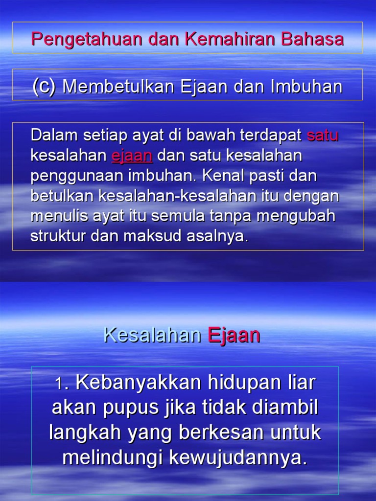 Layanan gratis google secara instan menerjemahkan kata, frasa, dan halaman web antara bahasa inggris dan lebih dari 100 bahasa lainnya. Download lagu ejaan bahasa melayu 3.23mb dan streaming kumpulan lagu ejaan bahasa melayu 3.23mb mp3 terbaru di metrolagu dan nikmati, video usahakan kalian download sebagai review saja, belilah cd original atau kalian beli secara online seperti di itunes untuk mendukung semua. I use bahasa melayu in indonesia 98% of the time during my travels there, only substituting certain words to make communication smoother (such as saying 'kamar mandi'. Gunakan tetingkap ejaan dan tatabahasa (ditunjukkan di bawah) untuk menyemak ejaan dan tatabahasa. Terdapat empat (4) jenis kesalahan dalam bahasa melayu